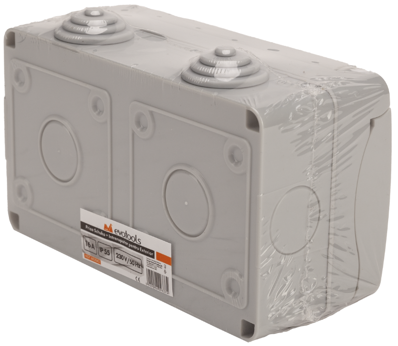 The combined set of Schuko socket and outdoor switch provides a complete and safe solution for controlling and powering equipment outdoors. Weather-resistant, ideal for gardens, terraces or exterior areas of the house, voltage 230V 16 A, protection rating IP 55.