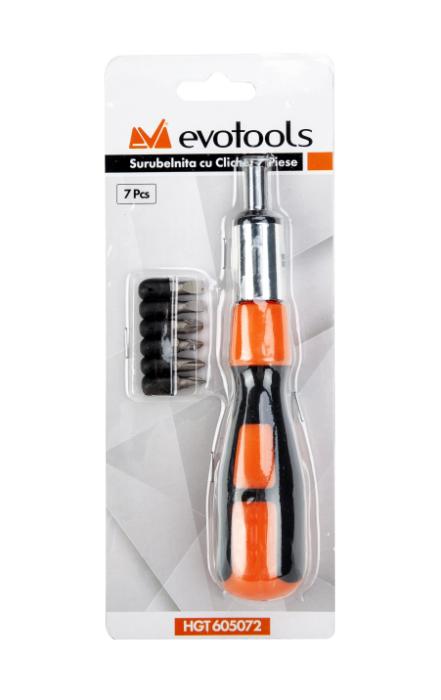 The EvoTools® ratcheting screwdriver features 6 bits made of Cr-V steel and a bi-material handle made of polypropylene and thermoplastic rubber (TPR). The high-quality ratchet allows optimal use, delivering high efficiency. The ergonomic handle reduces fatigue during use, providing a secure grip even when your hands are wet.