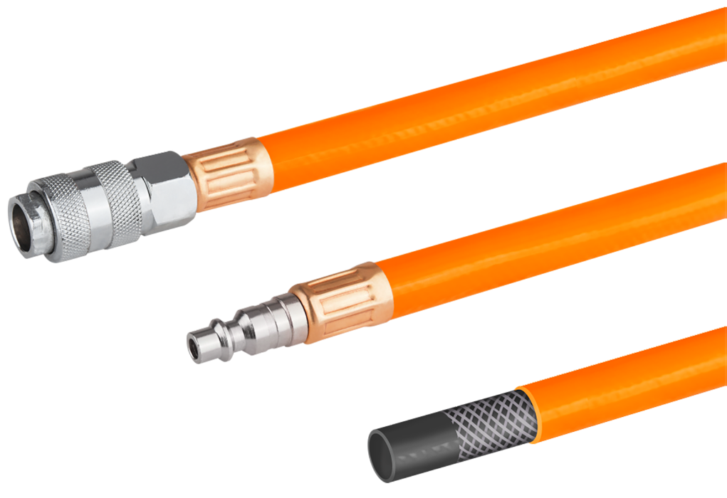 Pressure hose for compressors or spray guns Connection: quick couplings M/F Maximum working pressure: 20 bar (300 PSI) Air fitting diameter: 3/8"